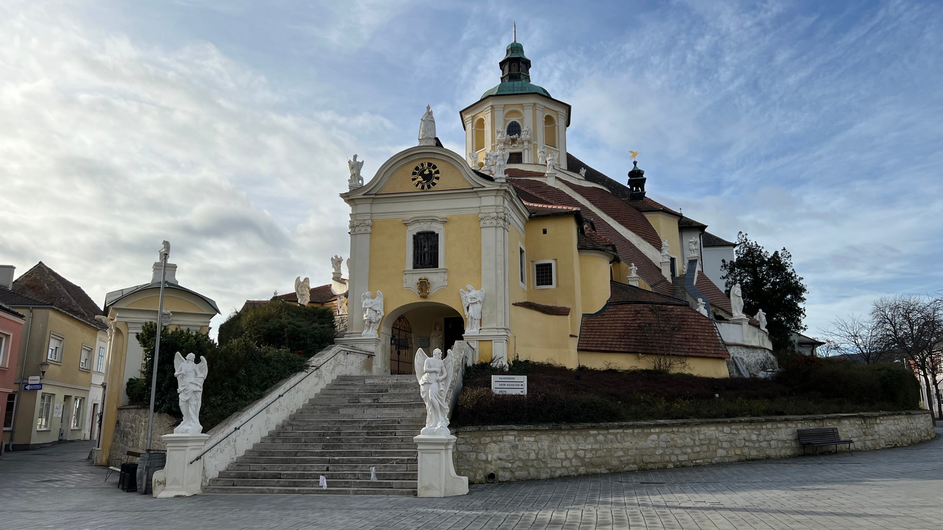 Man landet nach der Autofahrt auf einem gebührenpflichtigen Parkplatz beim Schloss und nach kurzem Rundgang nicht nur vor dem Kalvarienberg mit dem interessanten Dach ...
