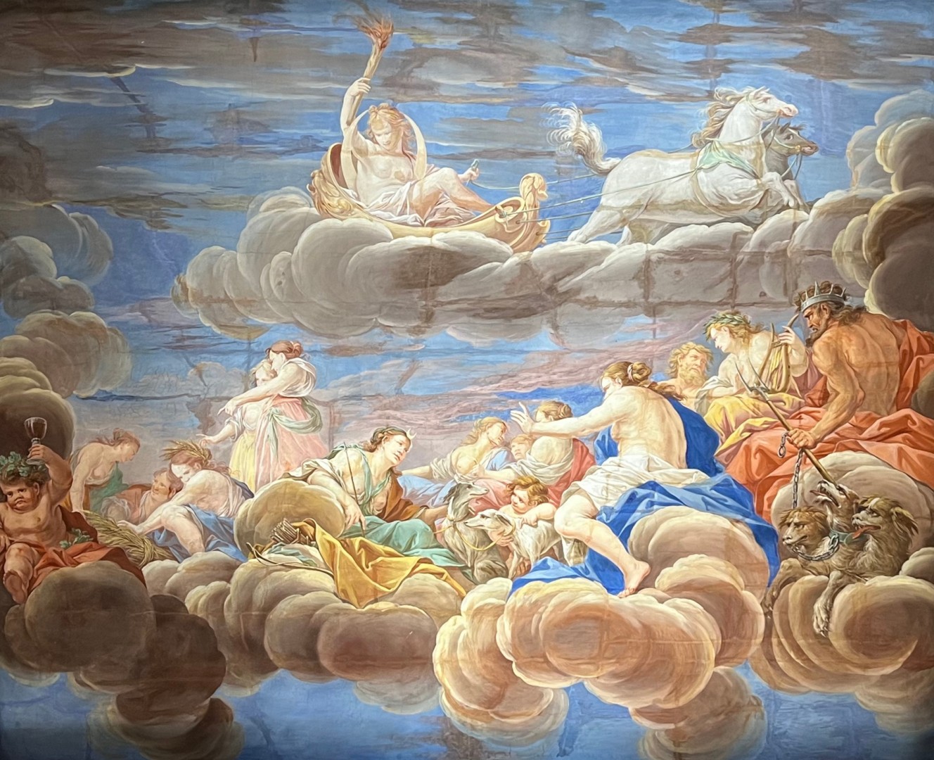 ... mit seinen Säulen und den Deckenfresken. Hier glaubt der Reisende Apollon mit der Fackel, Dionysos mit dem Weinkrug, Artemis mit Mondsichel, Bogen und Pfeilköcher und Hades mit dem dreiköpfigen Kerberos zu erkennen.