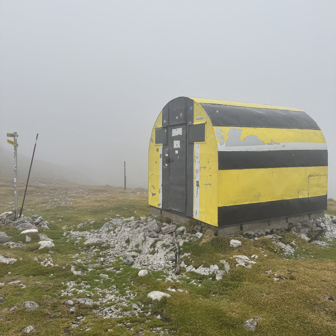 Laut dem GPS vom Mobiltelefon waren es sogar 2010 Meter. Egal, denn es wird immer unwirtlicher, bei steifer Brise wechselt der Regel in Graupelschauer, was den Wandersmann nicht davon abhält, das nächste Loch im Boden abzulichten.