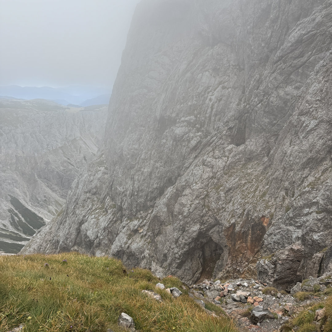 Mit grundlegendem Respekt vor der Tiefe kommt man beim Aufstieg in Richtung Schiestlhaus an einer Doline vorbei ...