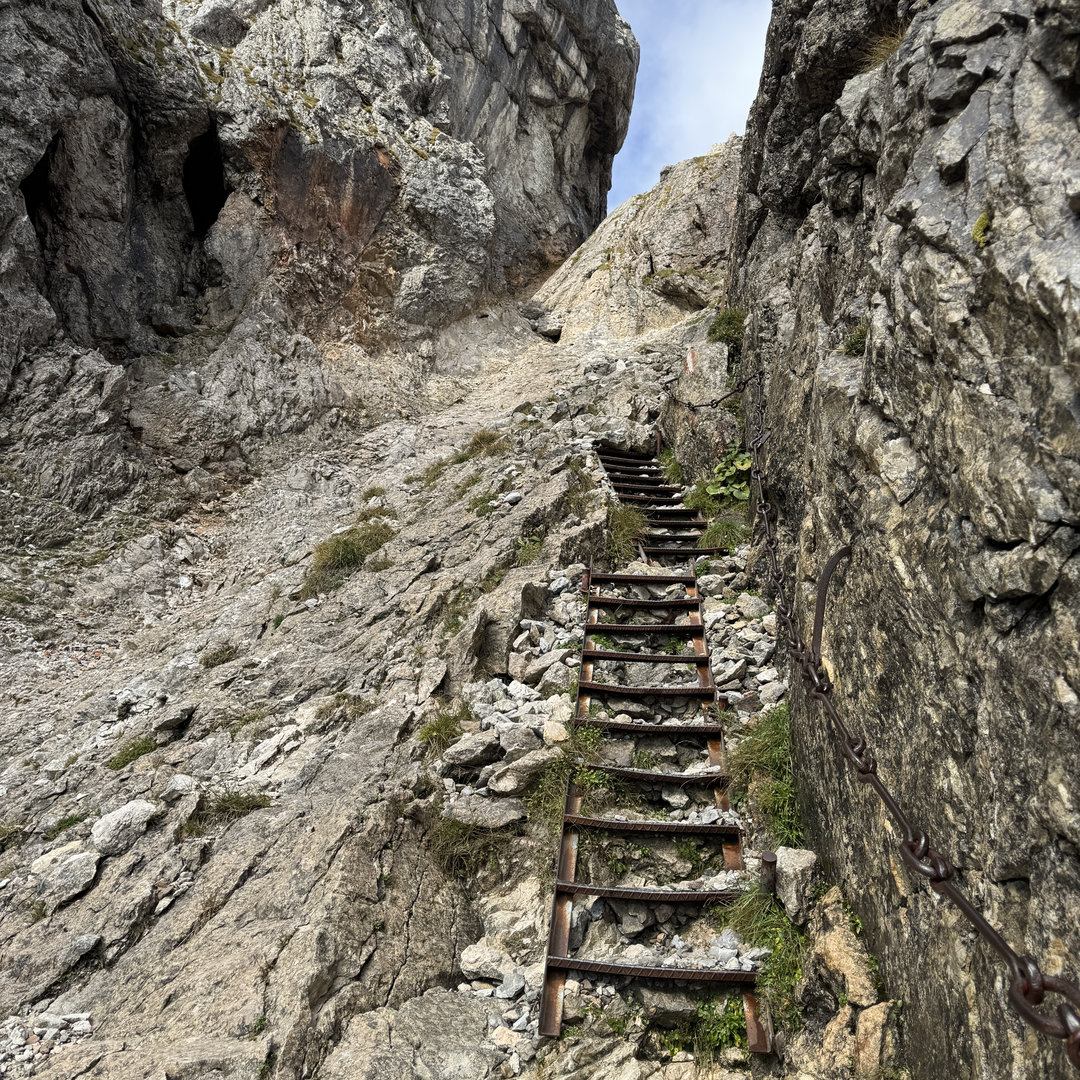Dort geht es an Ketten, Seilen und teilweise an Leitern steil bergab. Kaum ist man halbwegs unten ...