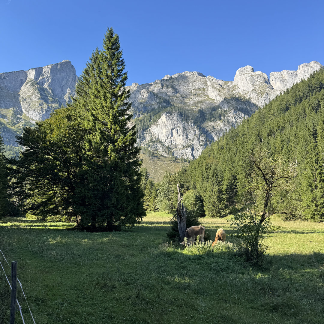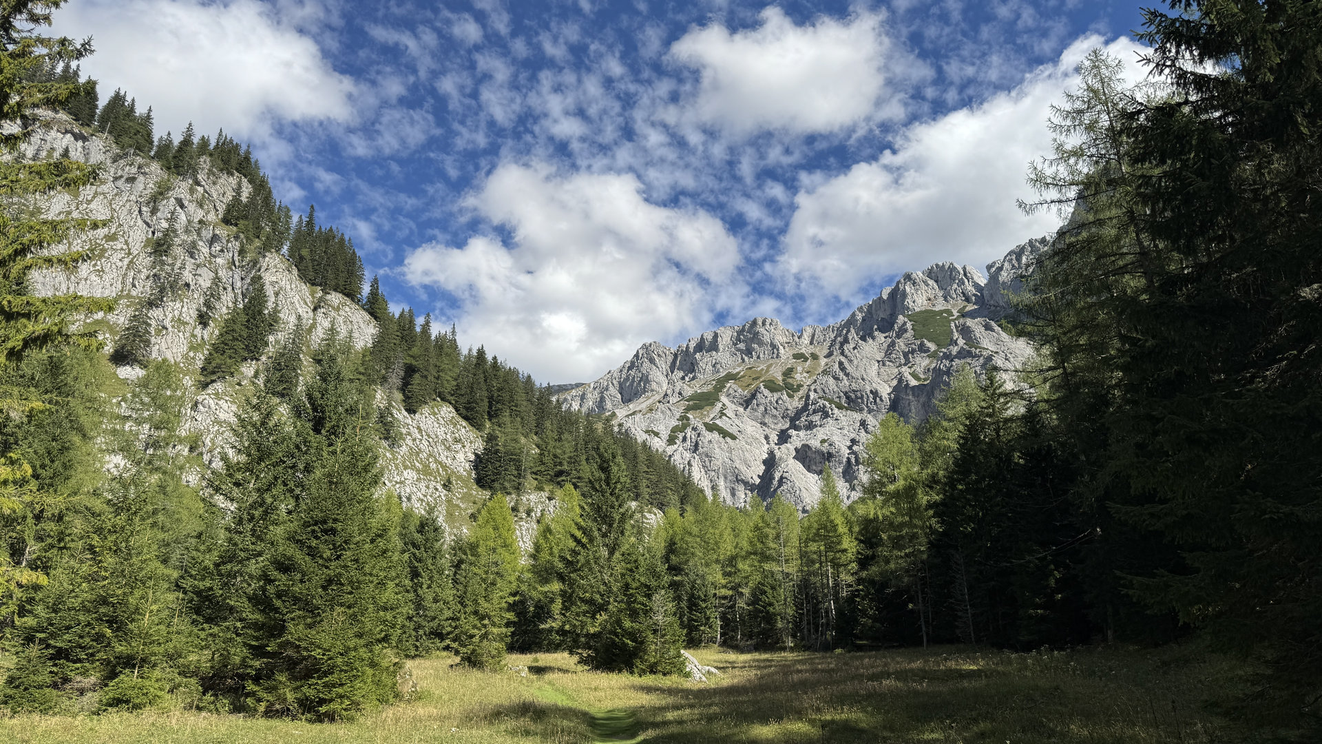 ... erreicht der Reisende wieder die - diesmal - sonnengeflutete Trawiesalm, wo ein Blick zurück geworfen wird.