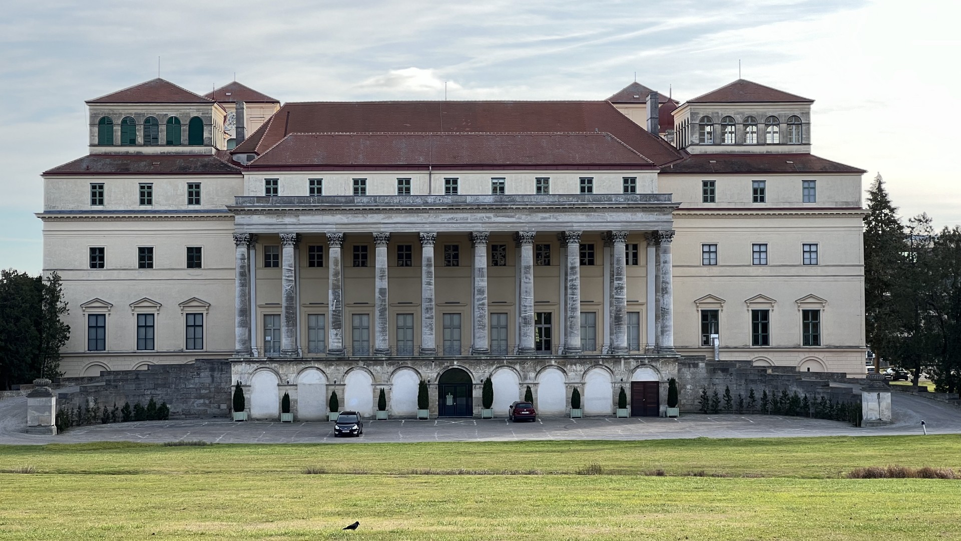 ... und einmal vom Parkbereich aus gesehen. Auffallend sind die prunkvollen Säulen.
