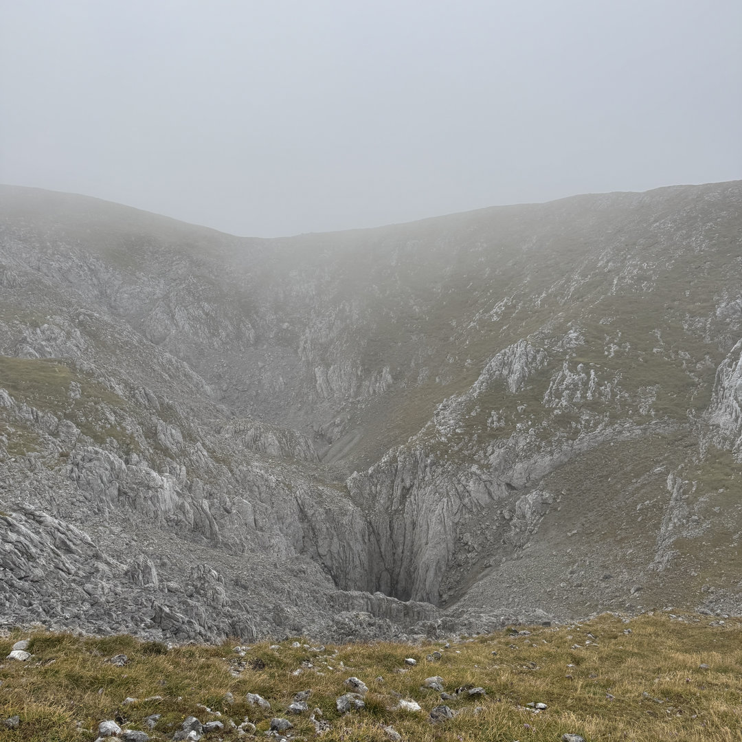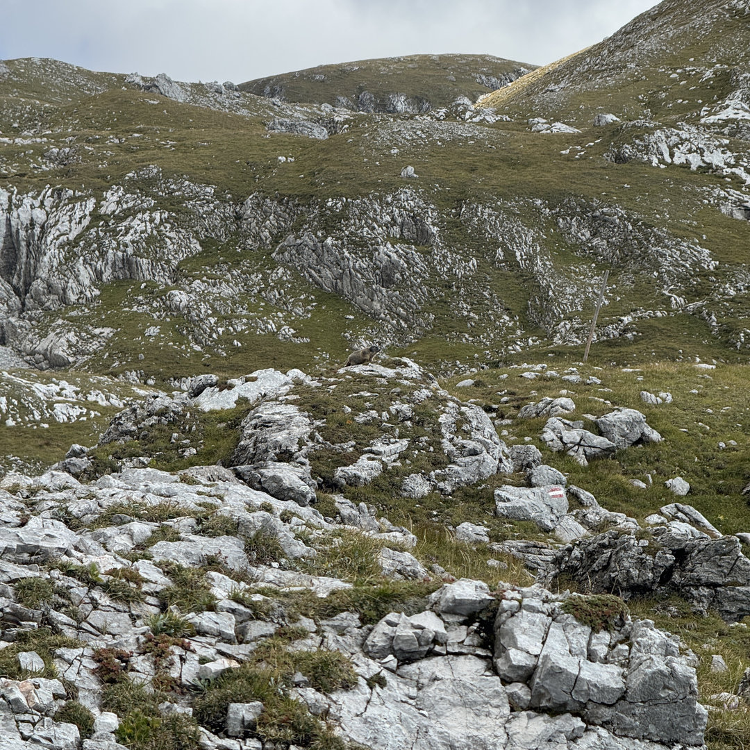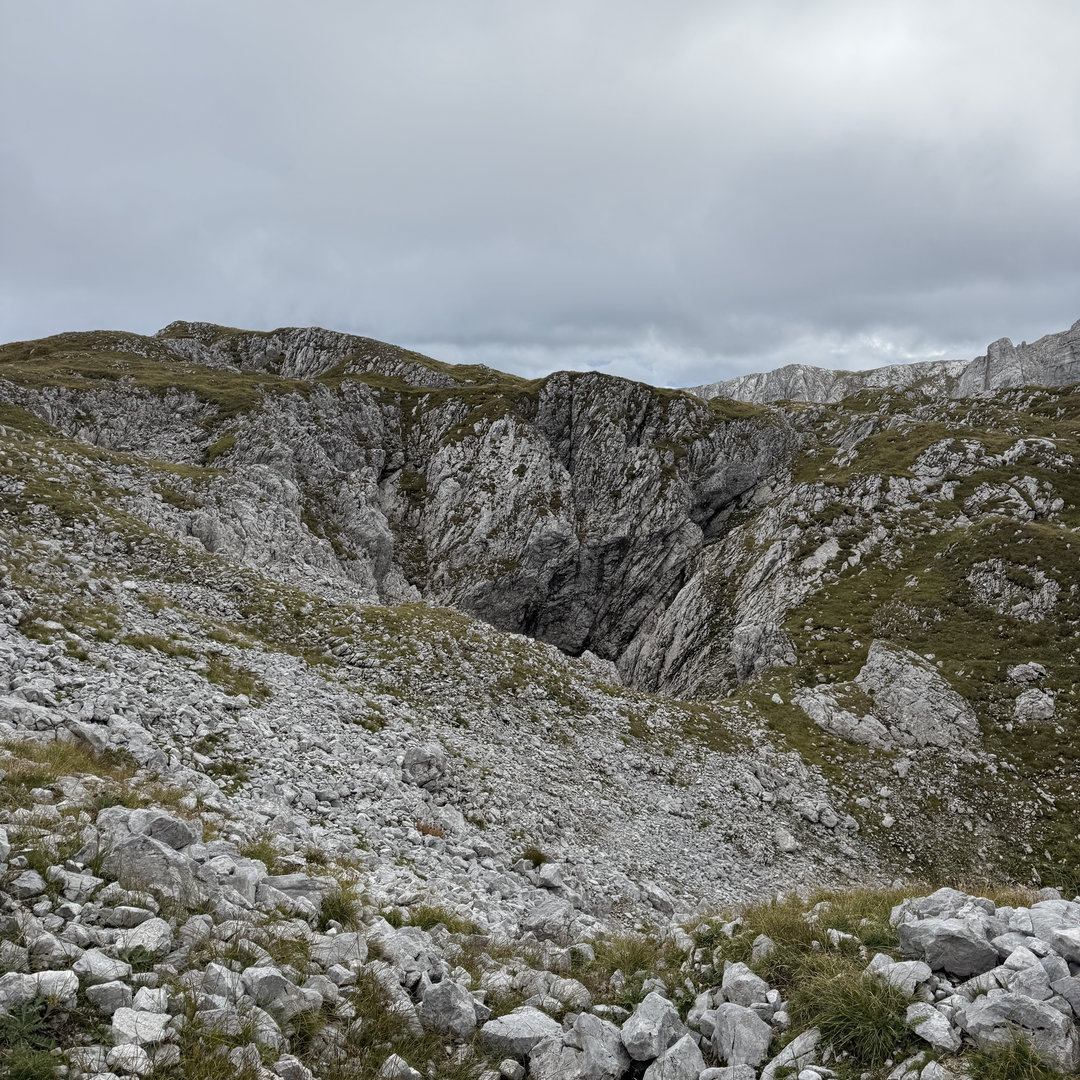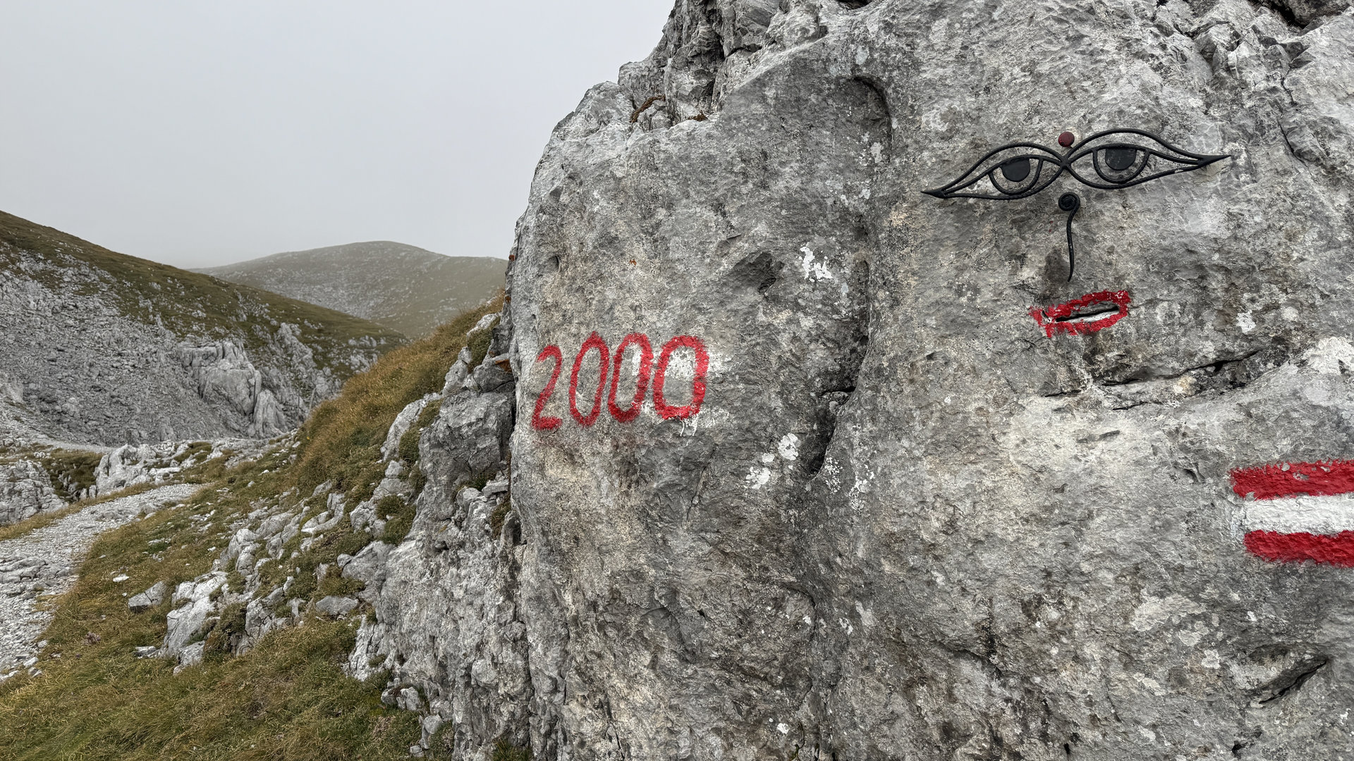 Laut dem GPS vom Mobiltelefon waren es sogar 2010 Meter. Egal, denn es wird immer unwirtlicher, bei steifer Brise wechselt der Regel in Graupelschauer, was den Wandersmann nicht davon abhält, das nächste Loch im Boden abzulichten.
