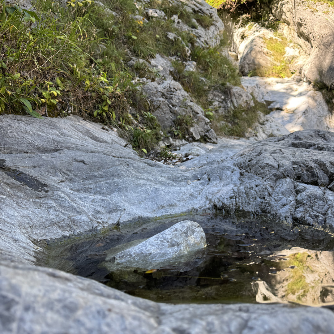 Nach einer Wegkehre in weißem Kalkstein, wo sich Wasser in kleinen Pfützen sammelt ...